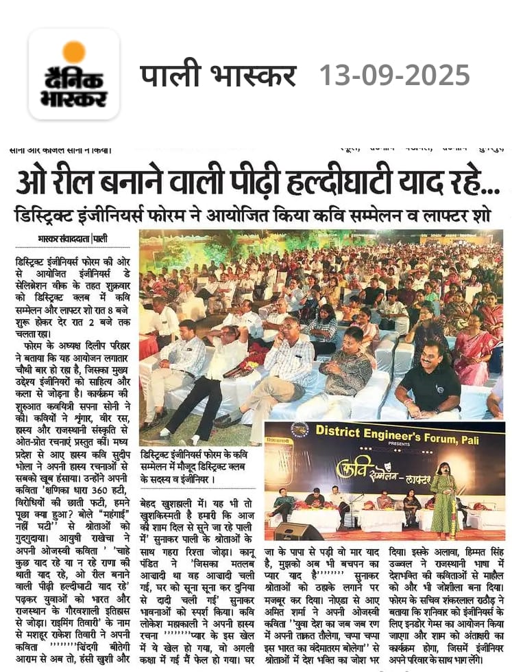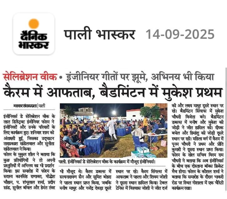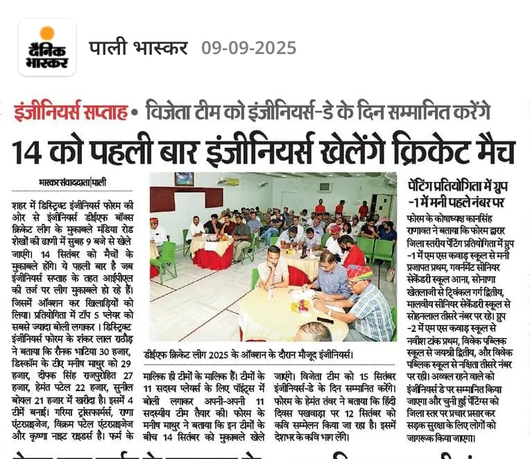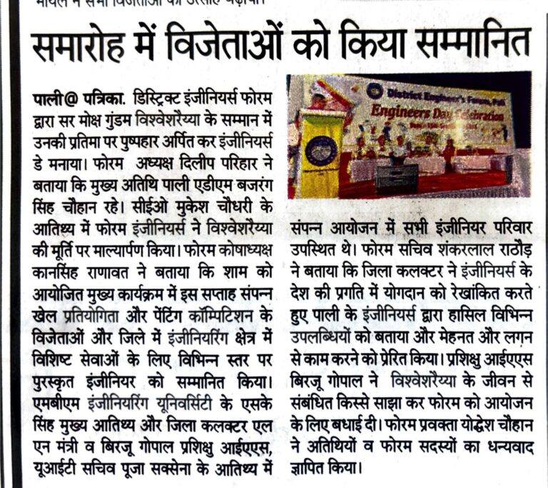 District Engineer Forum, Pali We Engineers Move the World. Er. Dilip Parihar President Er. Kan Singh Ranawat Treasurer Er. Shankar Lal Rathore Secretary Click Here for Full Executive Commitee List Events Painting CompetitionCricketKavi Sammlean- Laughter ShowGarlanding Ceremony 15th SeptemberAntakshariIndoor gamesTable Tennis (Indoor games)Volley BallMain Event- 15th September See More News From our blog Engineers Day Celebration by DEF in 2025 Antakshari and Cricket events during Engineers Day Celebration Week 2025 Kavi Sammelan Organised by DEF during Engineers Day Celebration Week 2025 Box Cricket under Engineers Day Celebration 2025 Teams for Box Cricket-2025 1 2 3 4 › Its a Shinto Creations